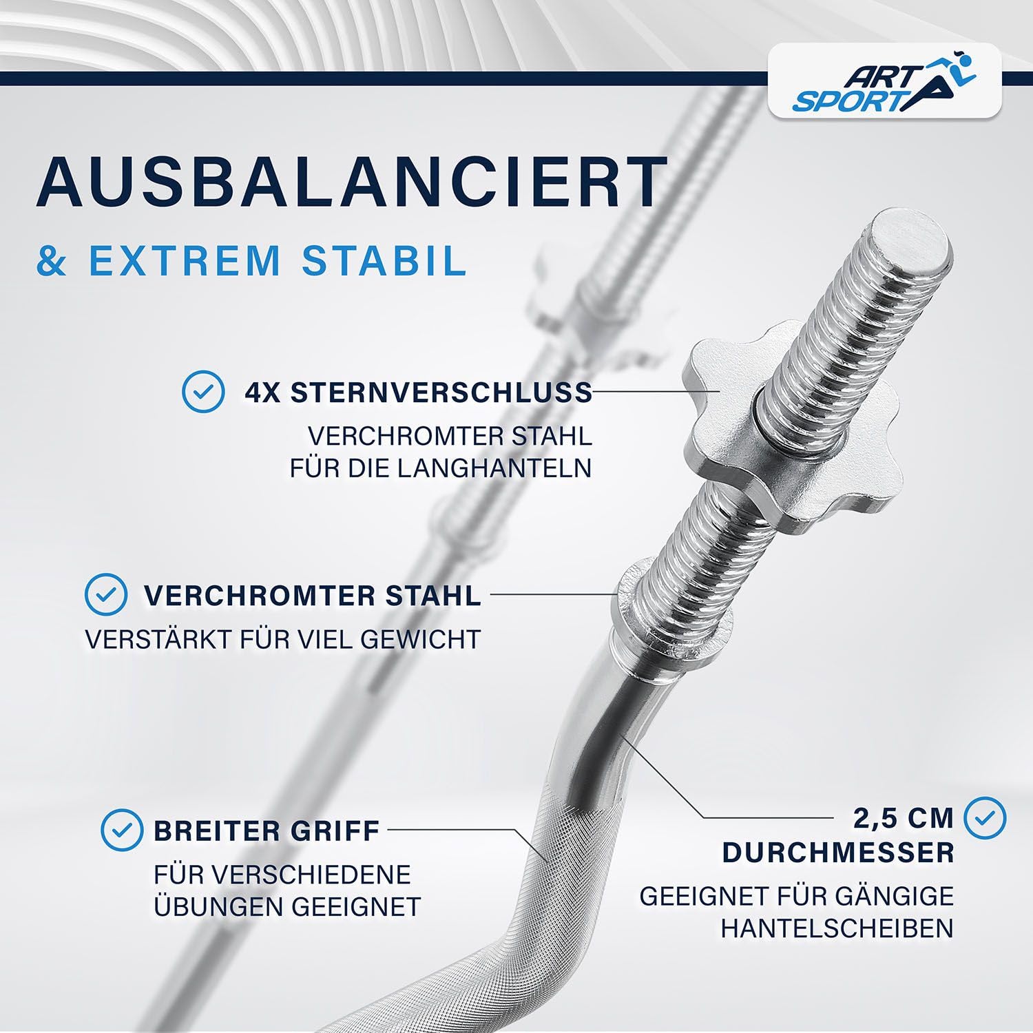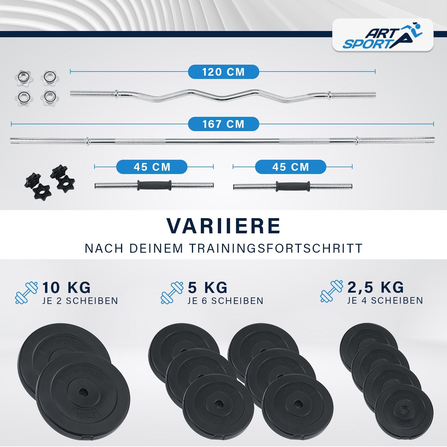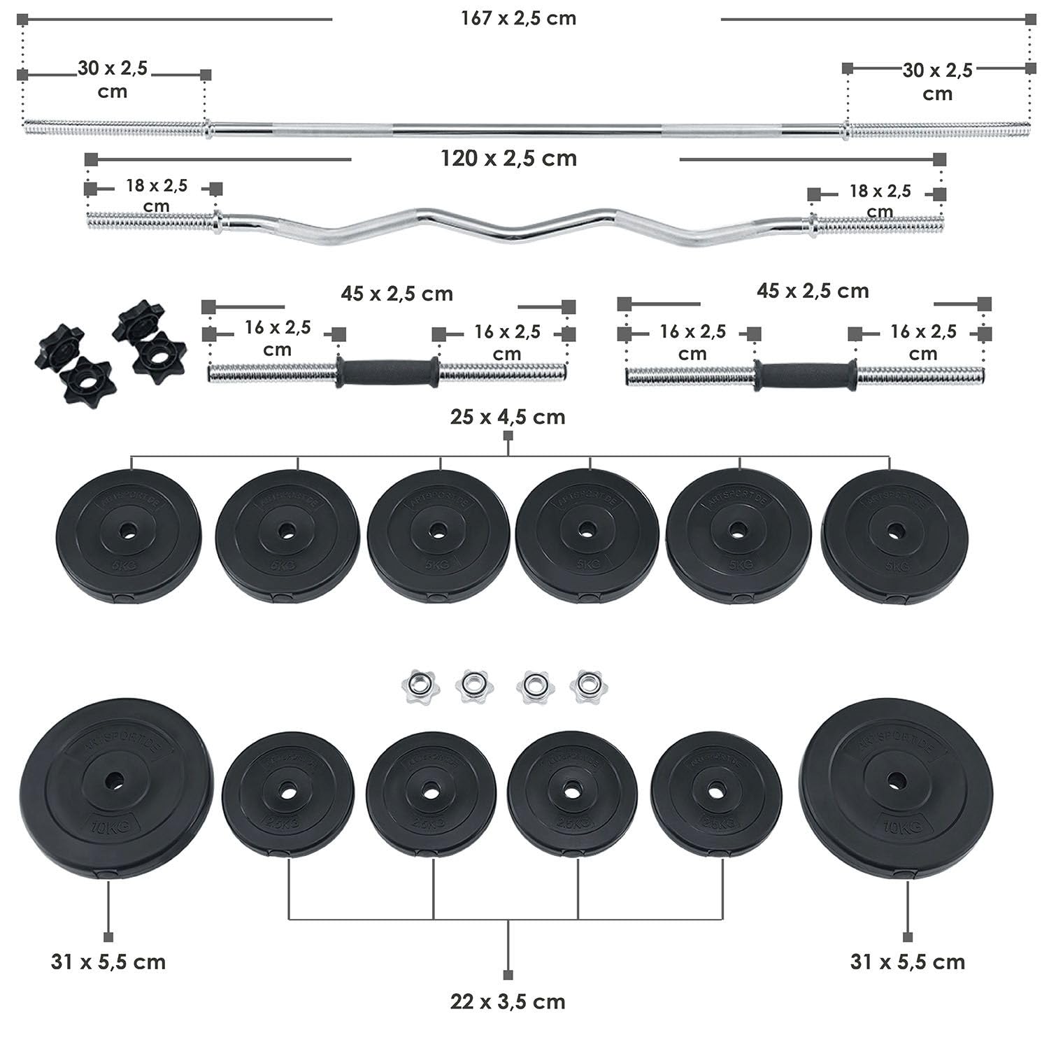 - ✔ Komplett-Set: 2x Kurzhantel (Länge: 45 cm), 1x Langhantel (Länge: 167 cm), 1x SZ Curlhantel (Länge: 120 cm). Dicke Stangen: 2,5 cm. Inklusive 60 kg Gewichte.