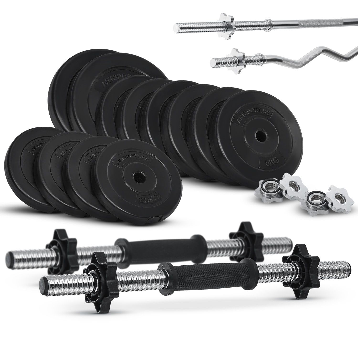 ArtSport 3in1 Hantelset mit 2 Kurzhanteln, 1 Langhantel & 1 SZ Curlhantel - 12 Gewichte mit 60kg und Sternverschlüssen - Hantel Set Krafttraining